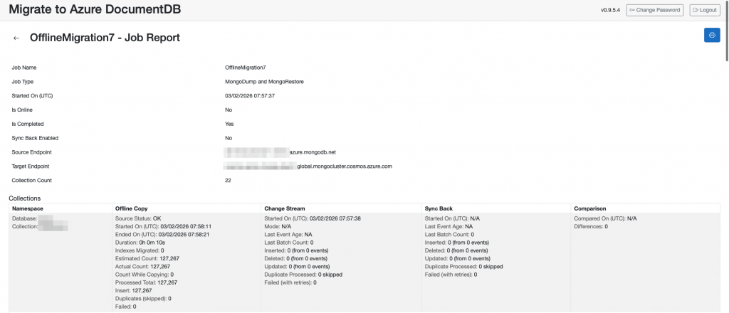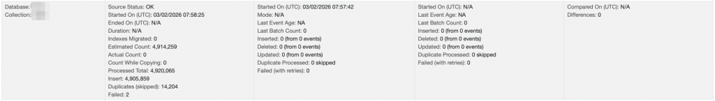After the migration executed you can see that the data was successfully transferred. Depending on your performance requirements you can dynamically scale up and down the number of dump, restore and insert workers.